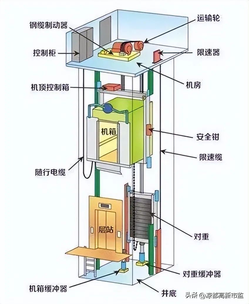 1.控制柜;2.导向轮;3.曳引钢丝绳;4. 曳引轮;5.轿厢;6.对重