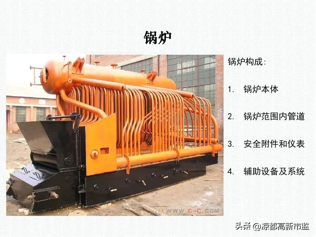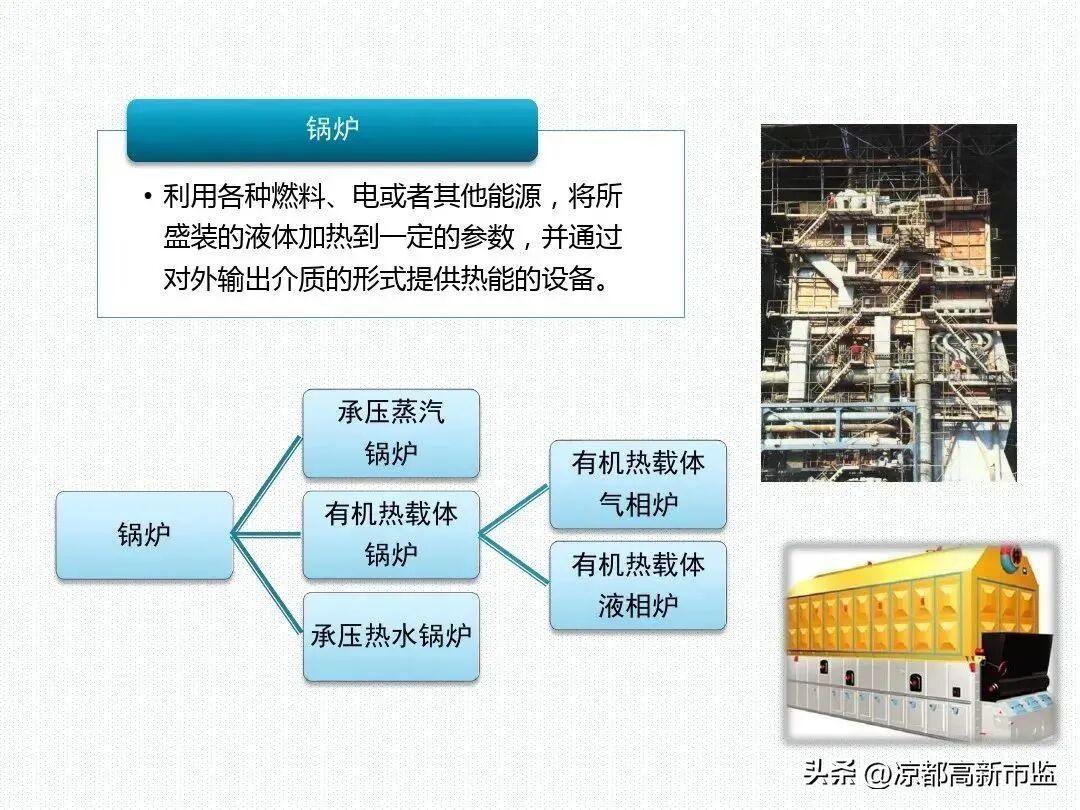 (1)锅炉,是指利用各种燃料、电或者其他能源,将所盛装的液体加热到一定的参数,并通过对外输出介质的形式提供热能的设备,其范围规定为设计正常水位容积大于或者等于30L,且额定蒸汽压力大于或者等于0.1MPa(表压)的承压蒸汽锅炉;出口水压大于或者等于0.1MPa(表压),且额定功率大于或者等于0.1MW的承压热水锅炉;额定功率大于或者等于0.1MW的有机热载体锅炉。
