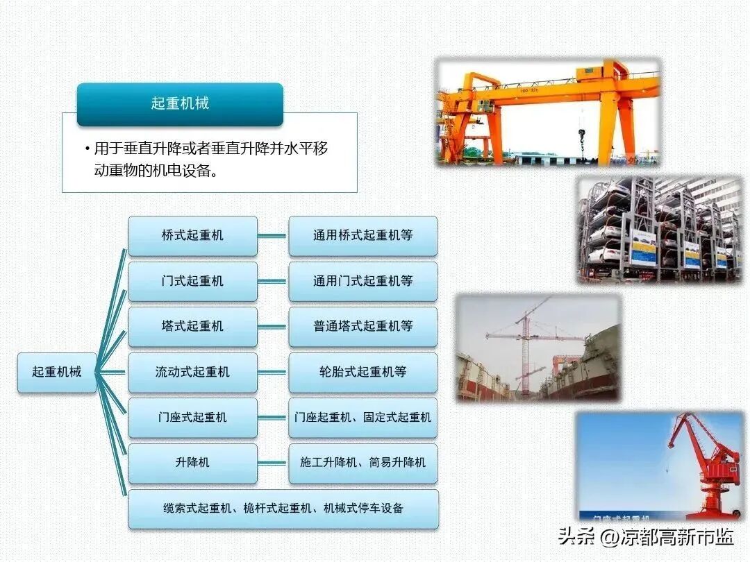 (5)起重机械,起重机械,是指用于垂直升降或者垂直升降并水平移动重物的机电设备,其范围规定为额定起重量大于或者等于0.5t的升降机;额定起重量大于或者等于3t(或额定起重力矩大于或者等于40t·m的塔式起重机,或生产率大于或者等于300t/h的装卸桥),且提升高度大于或者等于2m的起重机;层数大于或者等于2层的机械式停车设备。